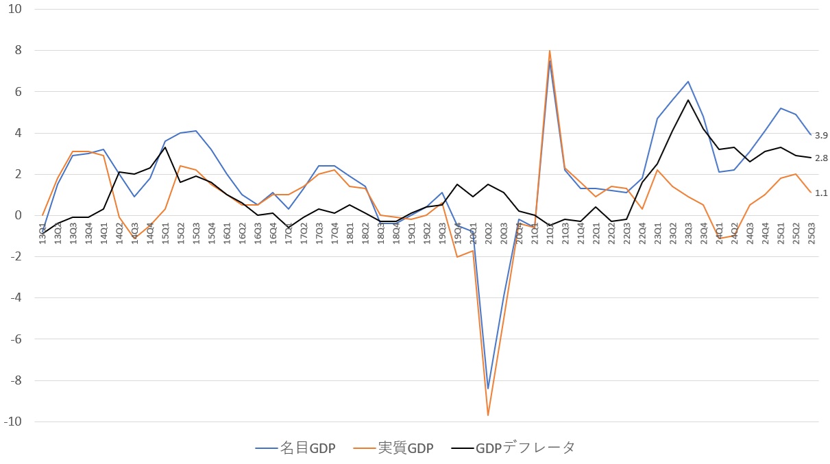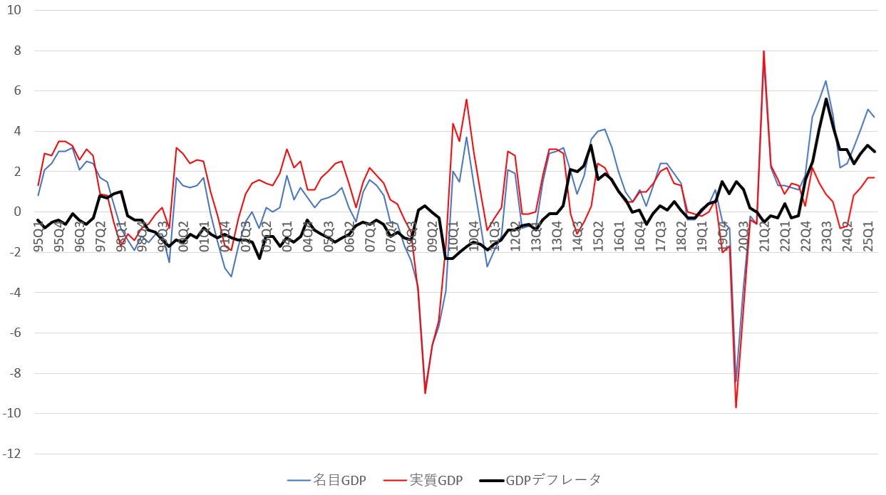 日本の名目GDP・実質GDP・GDPデフレータの推移(対前年比%)