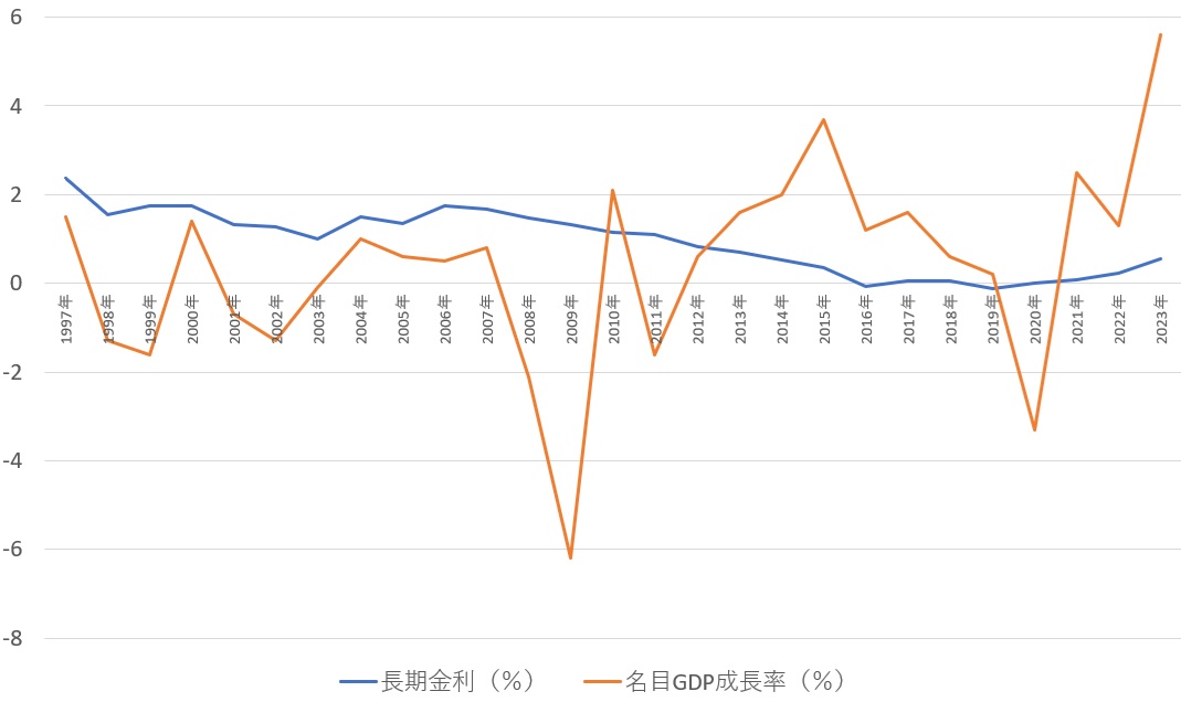 | 日本の国債金利(長期金利)と名目GDP成長率の推移 |